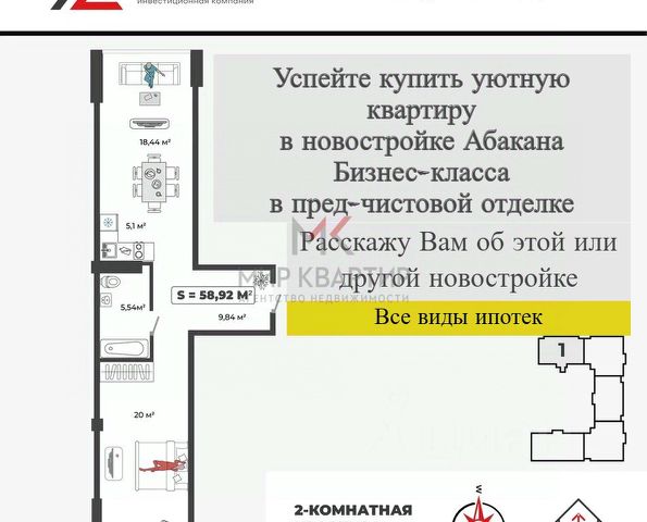 Арт. 128085579 Продаётся 1 комнатная квартира в престижной новостройке класса бизнес ЖК "Новый горизонт" "Новый горизонт" — это не просто жилой комплекс, а символ новой жизни, полной света, гармонии и возможностей. Идеальный баланс между работой и личной жизнью, безопасность, мобильность и свободные пространства — ключевые ценности, в престижном районе г. Абакана — районе Авиаторов. Основные характеристики: Общая площадь: 58.92 м² Дом монолит-кирпич Улучшенная шумоизоляция между соседями Сам жилой комплекс располагает подземной парковкой так же есть в продаже парковочные места. Во дворе дома находятся детская и спортивная площадки, где ваши дети смогут проводить время активно и безопасно. Для обеспечения вашей безопасности в доме работает консьерж, а территория закрыта от посторонних и ведётся круглосуточное видеонаблюдение Мы предоставляем юридическое сопровождение, услуги ипотечного брокера (одобрение ипотеки), договариваемся о максимальной выгодной покупки квартиры для Вас у застройщика. Показ организуем в любое удобное для Вас время БЕСПЛАТНО и БЕЗ КОМИССИИ
