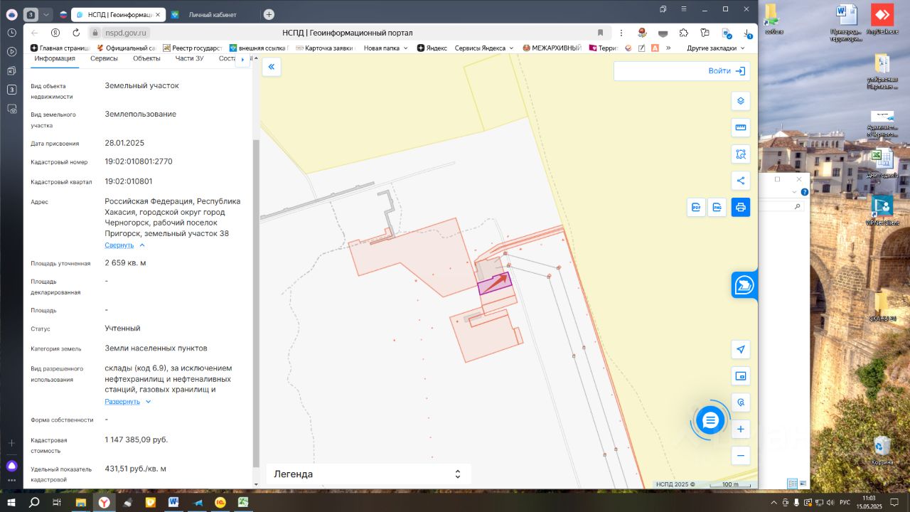 Российская Федерация, Республика Хакасия, городской округ город Черногорск, рабочий поселок Пригорск, земельный участок 38, кадастровый номер: 19:02:010801:2770, площадь: 2 659,0 кв.м., вид разрешенного использования: склады (код 6.9), за исключением нефтехранилищ и нефтеналивных станций, газовых хранилищ и обслуживающих их газоконденсатных и газоперекачивающих станций, категория земель: земли населенных пунктов.