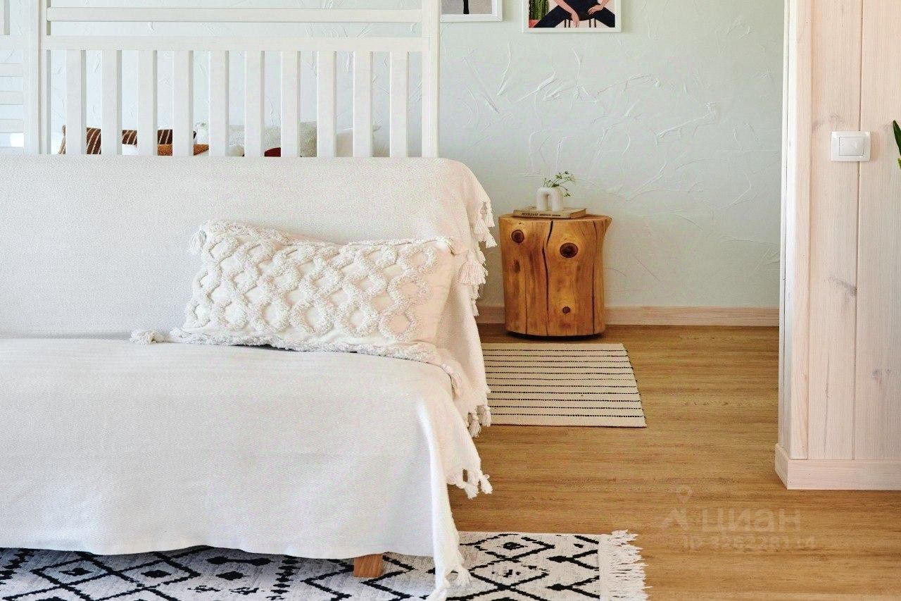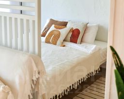 В большой комнате-гостиной расположен диван, в нише - большая двуспальная кровать. Рядом - тумбочки и вместительный комод для вещей.