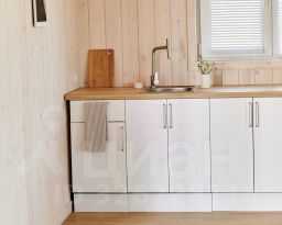 В гостиной оборудована кухня с встроенным холодильником, индукционной плитой и большой зоной готовки.