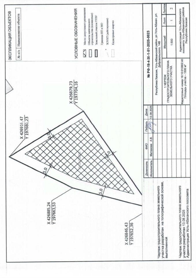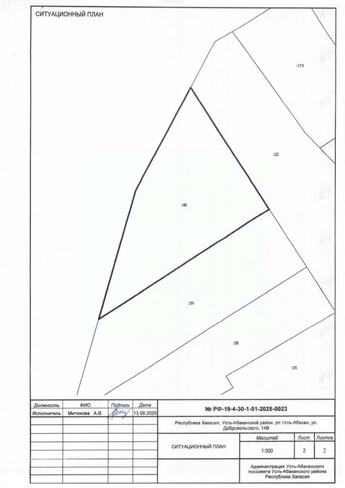 Земельный участок с кадастровым номером 19:10:010802:40 площадь 1500 по адресу Республика Хакасия, Усть-Абаканский район, рп Усть-Абакан, ул. Добровольского, 14В