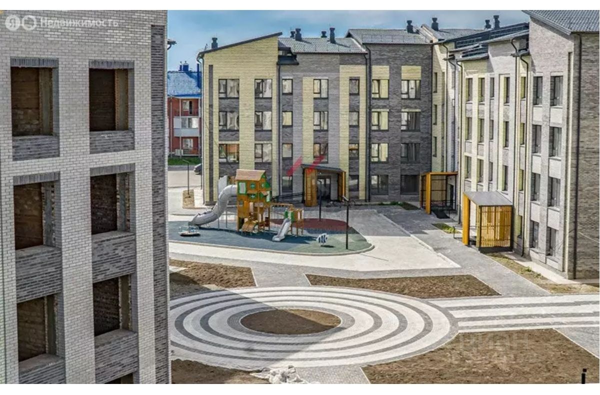 Красивое оформленние придомовой территории: дорожки выложены брусчаткой, установлены лавочки, детские игровые комплексы, фонари, подсветка.