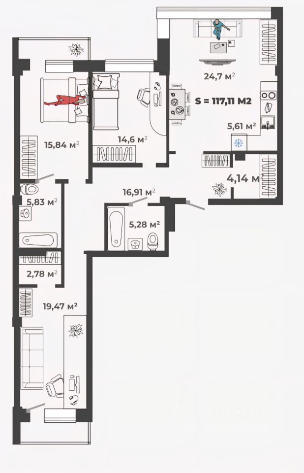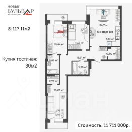 Вашему вниманию 4-х комнатная квартира 117 м2 с просторной кухней-гостиной 30м2 в жилом комплексе "Новый Бульвар"! Ввод в эксплуатацию планируется в начале 2026г.