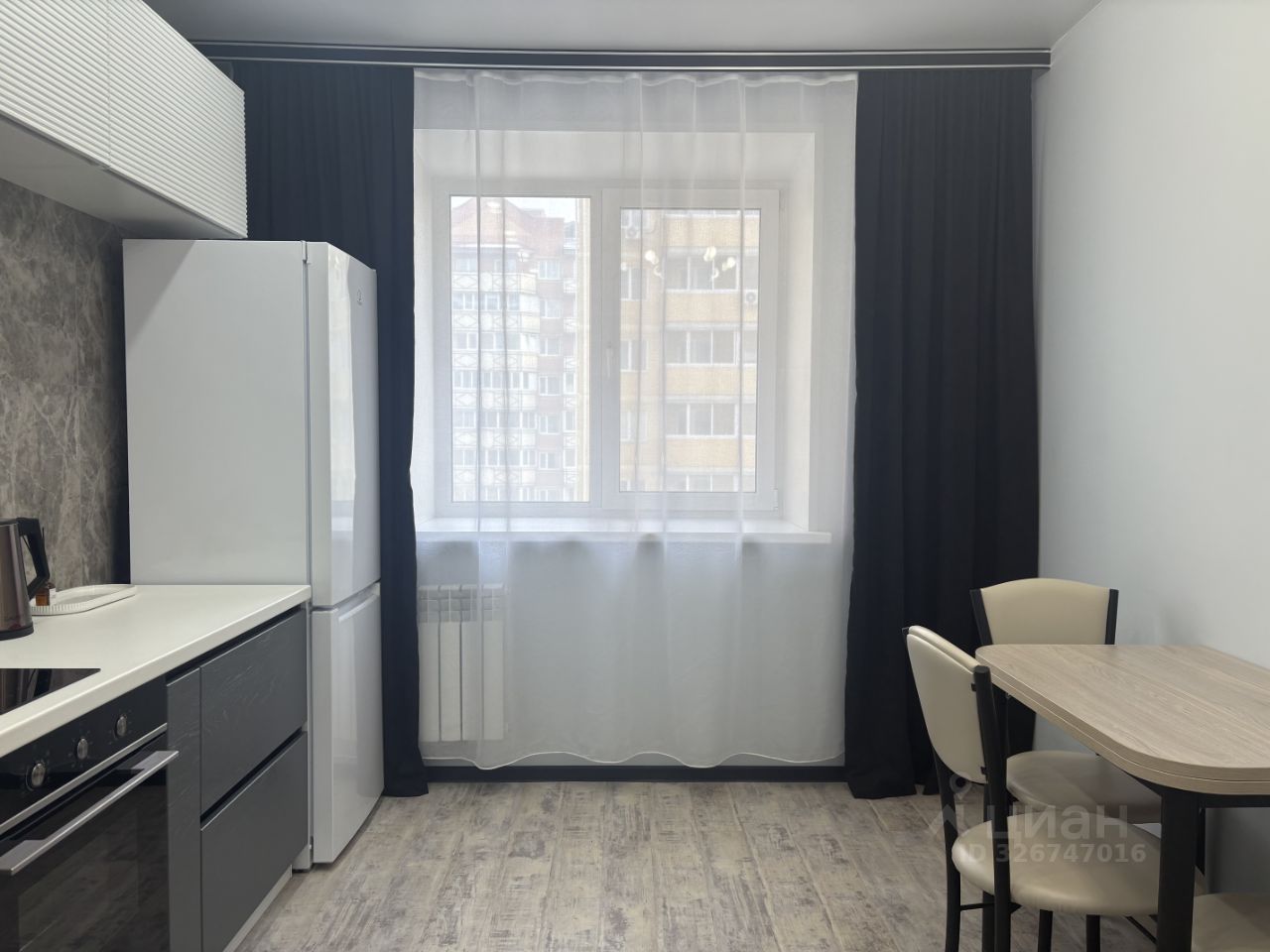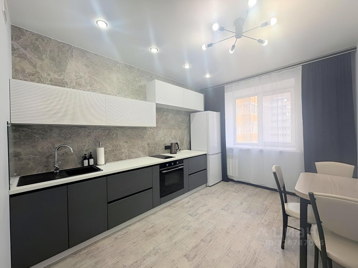В квартире остается кухонный гарнитур со встраиваемой техникой, вытяжка, стол со стульями, шкафы-купе.