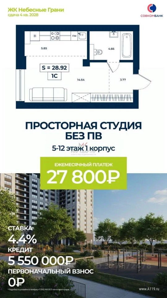 Арт. 131654434 Квартира без первоначального взноса ПОД 4,4%