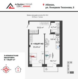 Продаётся 2-комнатная квартира в строящемся доме (1,2 этап), срок сдачи: II-кв. 2026, общей площадью 60.64 кв.м., на 8 этаже. Новый жилой комплекс "Новый Бульвар" от застройщика "СЗ АльфаГрупп" расположен по адресу: г. Абакан, улица Генерала Тихонова.