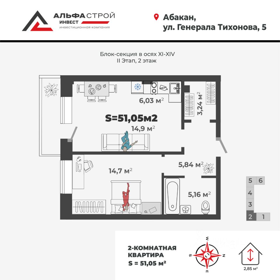 Продаётся 1-комнатная квартира в строящемся доме (1,2 этап), срок сдачи: II-кв. 2026, общей площадью 50.92 кв.м., на 8 этаже. Новый жилой комплекс "Новый Бульвар" от застройщика "СЗ АльфаГрупп" расположен по адресу: г. Абакан, улица Генерала Тихонова.