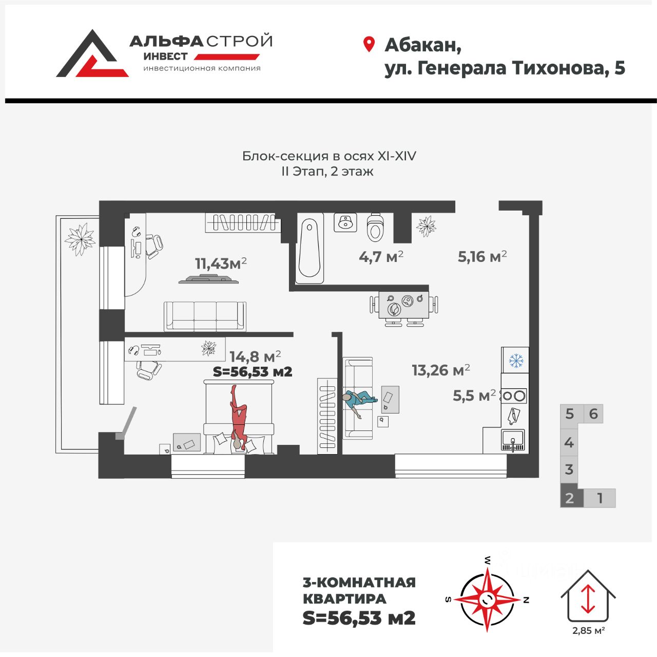 Продаётся 2-комнатная квартира в строящемся доме (1,2 этап), срок сдачи: II-кв. 2026, общей площадью 56.32 кв.м., на 10 этаже. Новый жилой комплекс "Новый Бульвар" от застройщика "СЗ АльфаГрупп" расположен по адресу: г. Абакан, улица Генерала Тихонова.