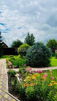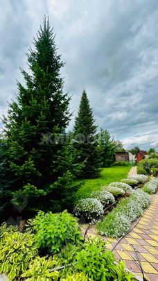 Сад с ландшафтным дизайном, шикарный газон, посажены голубые ели, пихты кедры, разнообразие многолетних растений.