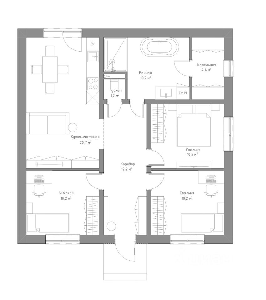 У данного дома есть несколько видов комплектации: от теплого контура до строительства под ключ с ремонтом
